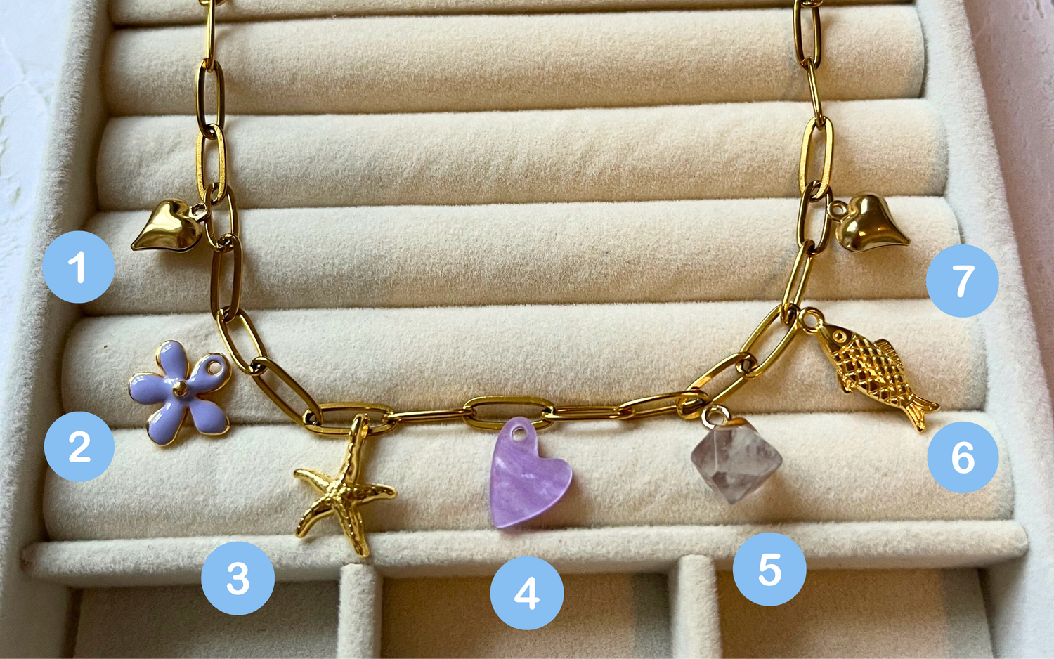 3. At checkout fill in the 'order special instructions' box with numbers 1 -7 clearly stating the order of the charms to be attached from left to right (see image on left)