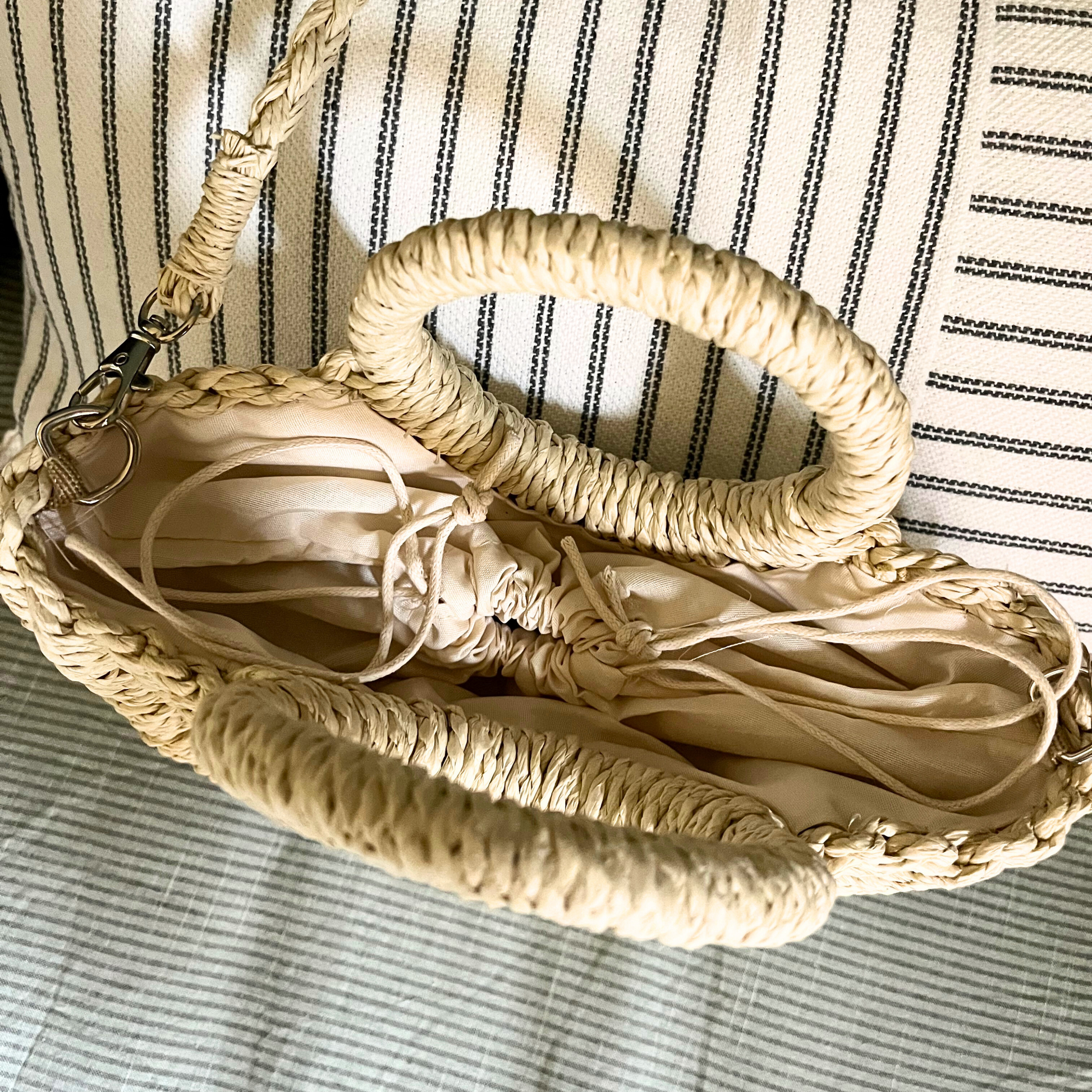 Handwoven from natural paper straw, this versatile bag is the perfect summer companion. Designed with a detachable shoulder strap, it can be worn crossbody, on the shoulder, or styled as a chic clutch. The soft inner lining secures your essentials with an easy drawstring closure.